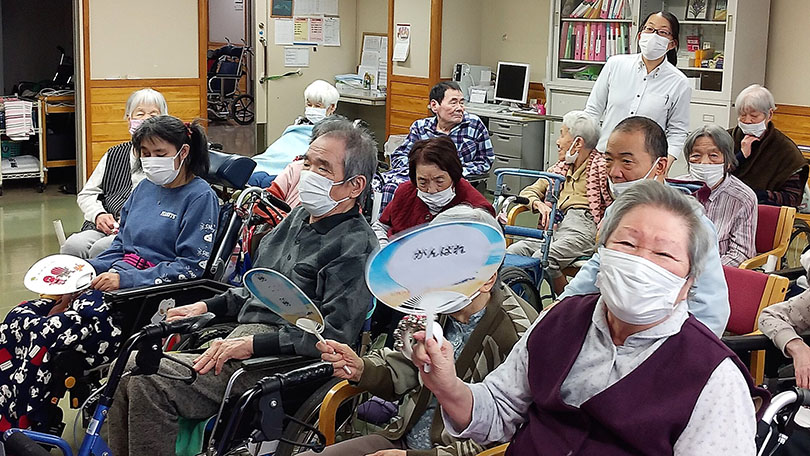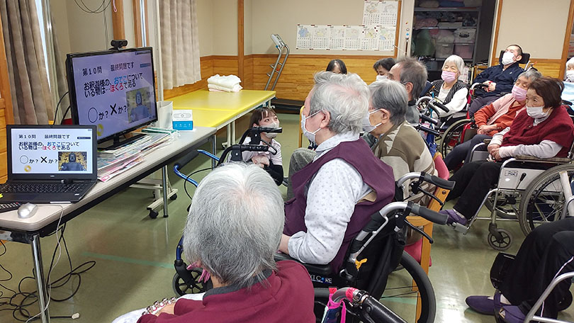 クイズ大会は1階の特設会場にて開催されました。特養さくらは「メロン」と「リンゴ3人娘」の2チームが参加されました。参加人数が限られており、他の皆さんには特設会場の様子をモニターでつなぎ、2階にある観戦スペースにて応援をしました。