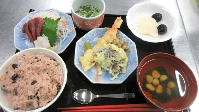 入居者の皆さんには、お赤飯と「刺身」または「天ぷら(抹茶塩)」から選べるお祝い膳をご提供しました。