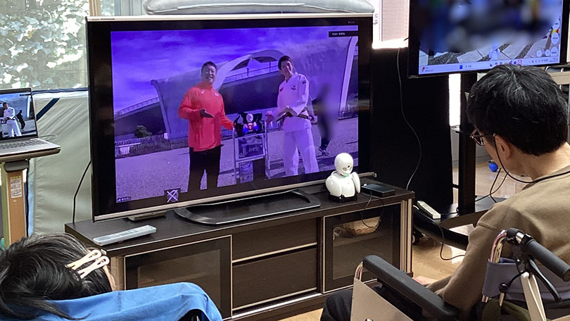 会場では、ステージイベントやデフスポーツ・パラスポーツの体験などが行われており、施設のご利用者は分身ロボット「OriHime」を遠隔操作して参加しました。施設内では、「OriHime」の視点で映し出される画面に加えて、「OriHime」の周囲の様子を映した画面も見ながら、現地の雰囲気を感じていました。