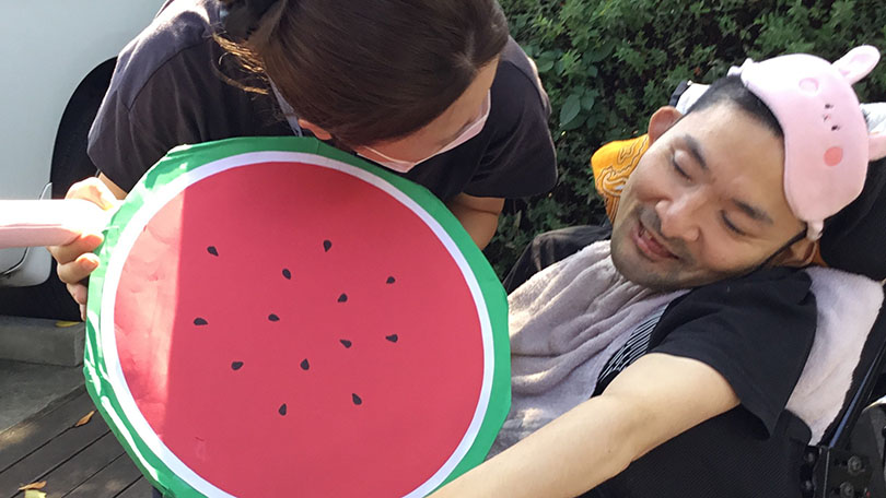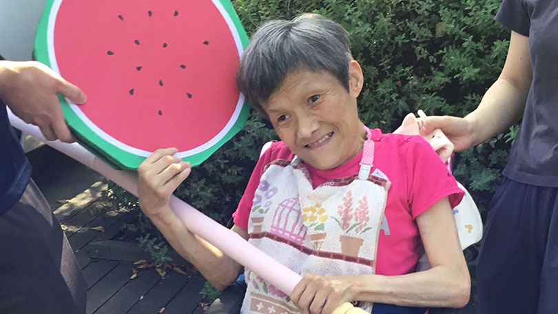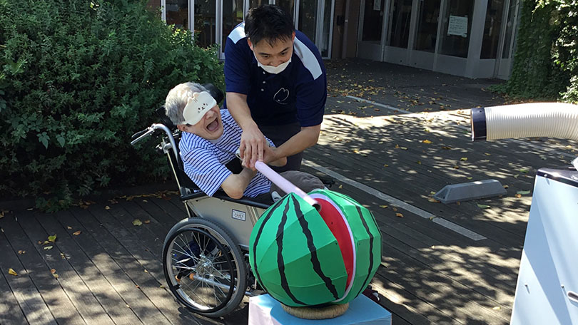 夏のイベント「ナツみずき」を開催しました。内容は夏の映画上映会とすいか割りです。昨年ご利用者から好評だったので今年もすいか割りを行いました。すいかは職員の手づくりですが、張り切って昨年より大きなすいかを準備。