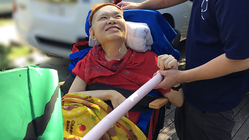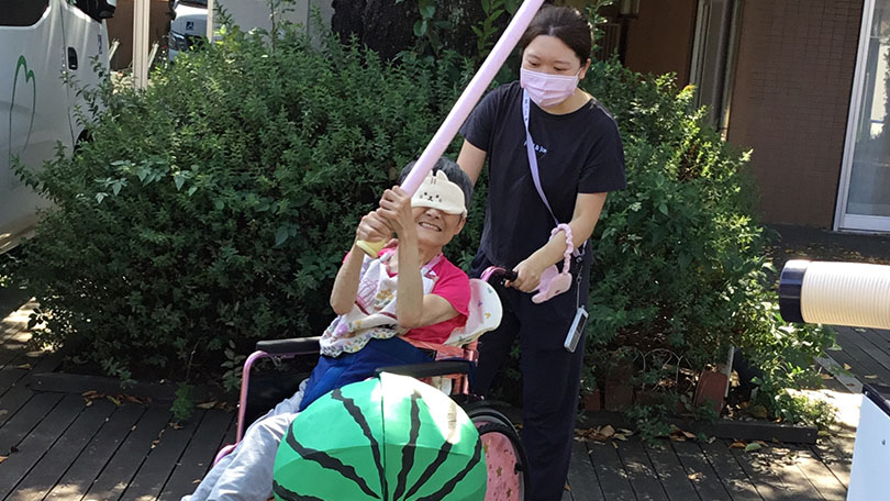すいかがパカっと割れると、ご利用者も職員も笑顔がこぼれます。暑い夏に、熱いすいか割り!みんなで夏のひとときを楽しみました。