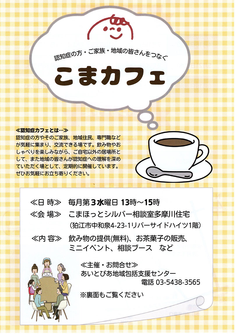 「こまカフェ」は認知症の方やそのご家族・地域の皆さん・専門職などが気軽に集まり、交流できる場です。飲み物やおしゃべりを楽しみながら、ご自宅以外の居場所として、また地域の皆さんが認知症への理解を深めていただく場として定期的に開催します。