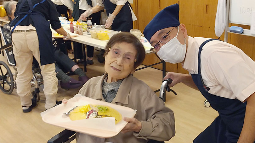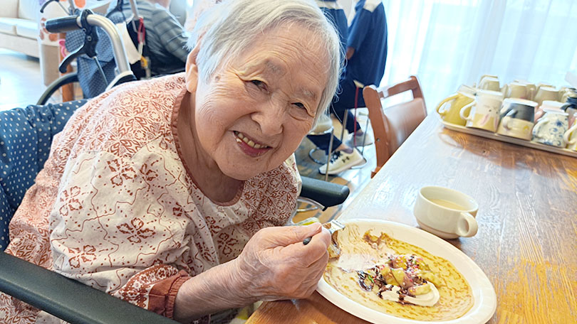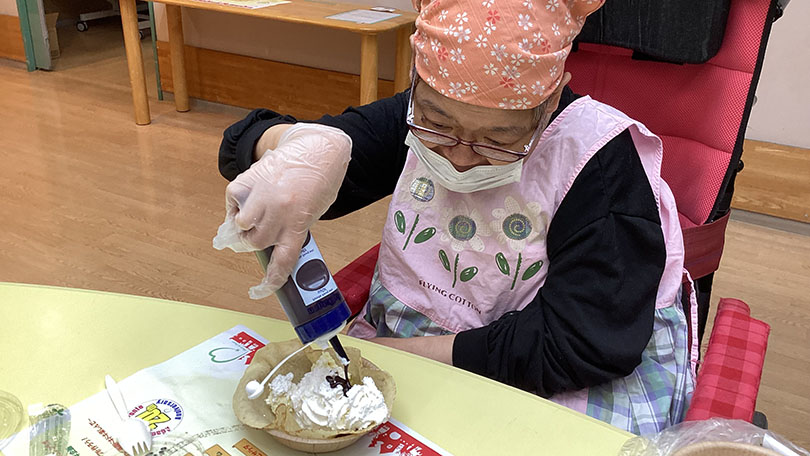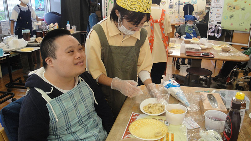 「またやりたい」、「おいしかった」、「職員に巻き方を聞いて上手に食べることができた」など沢山の喜びの声をいただきました。食セクションの恒例イベント「巨大ケーキでデコりんこ」は参加者全員でひとつのケーキをつくりあげる楽しさがあります。今回のクレープづくりは、それとはひとあじ違い、自分好みのものにできる楽しさがあり、実際にこちらが想像していた以上に、ご利用者・職員の笑顔や歓声に包まれたイベントになりました。